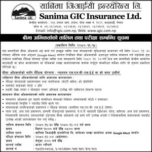 काठमाण्डौ । सानिमा जिआईसी इन्स्योरेन्स लिमिटेडले बीमा अभिकर्ता तालिम सञ्चालन गर्ने भएको छ । कम्पनीले भर्चुअल माध्यमबाट निर्जीवन बीमा अभिकर्ताको आधारभूत तालिम सञ्चालन गर्न लागेको हो ।
