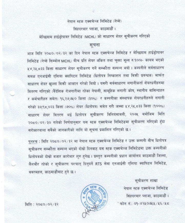 काठमाडौं । मेन्छियाम हाइड्रोपावरको शेयर नेप्सेमा सूचीकृत भएको छ । कम्पनीको ५४ लाख २५ हजार ८३३ कित्ता शेयर आज (बिहीबार) नेप्सेमा सूचीकृत भएको हो ।