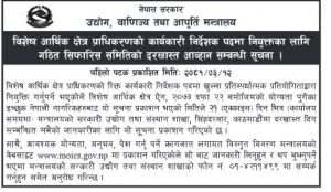 काठमाडौं । उद्योग वाणिज्य तथा आपूर्ति मन्त्रालयले विशेष आर्थिक क्षेत्र प्राधिकरणको कार्यकारी निर्देशक पदमा दरखास्त आह्वान गरेको छ।