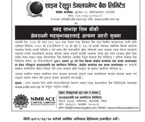 काठमाडौं । शाइन रेसुङ्गा डेभलपमेण्ट बैंक लिमिटेडले नगद लाभांश रकम बुझिलिन आग्रह गरेको छ । बैंकको विभिन्न साधारणसभाले पारित गरेको नगद लाभांश बुझ्न बाँकी शेयरधनीहरूलाई यथाशीघ्र बुझिलिन बैंकले आग्रह गरेको हो ।