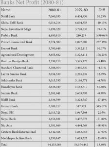 अघिल्लो वर्षको सोही अवधिको तुलनामा यो १३.४० प्रतिशतले धेरै हो। अघिल्लो वर्ष यिनीहरुले ५६ अर्ब ५७ करोड ४४ लाख रुपैयाँ नाफा आर्जन गरेका थिए। यसमध्ये सबैभन्दा धेरै खुद नाफा कमाउने बैंकमा नबिल रहेको छ । बैंकले ७ अर्ब ६ करोड रुपैयाँ बराबरको खुद नाफा आर्जन गरेको छ । यो अघिल्लो वर्षको तुलनामा १०.२३ प्रतिशत धेरै हो ।