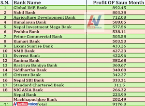 काठमाडौं। हाल सञ्चालनमा रहेका वाणिज्य बैंकहरूले चालु आर्थिक वर्षको साउन महिनामा नौ अर्ब १७ करोड रुपैयाँ खुद नाफा गरेका छन् । नेपाल राष्ट्र बैंकले सार्वजनिक गरेको विवरण अनुसार सञ्चालनमा रहेका २० वटा वाणिज्य बैंकहरुले उक्त रकम नाफा आर्जन गरेका हुन् ।