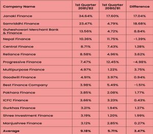 एक वर्षको अवधिमा फाइनान्स कम्पनीहरूको खराब कर्जा औसतमा ३.४१ प्रतिशत बिन्दुले बढेर ९.१८ प्रतिशत पुगेको छ। २०८० असोज मसान्तमा फाइनान्सहरूको औसतमा खराब कर्जा ५.७१ प्रतिशत थियो।