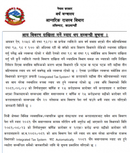 आन्तरिक राजस्व विभागले गत असोज ४ गते वार्षिक १ करोडसम्म कारोबार गर्ने एकलौटी फर्म र शून्य कारोबार भएका निकायको सम्बन्धमा आय विवरण दाखिला गर्ने म्याद थप नहुने व्यवस्था गरेको थियो । तर, वार्षिक २५ करोडसम्म कारोबार भएका निकाय र अन्य करदाताहरुका सम्बन्धमा मंसिर मसान्तसम्म मात्र म्याद थप हुनेछ ।