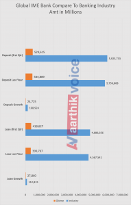 जबकि, बैंकिङ इन्डष्ट्रिको निक्षेप संकलन वृद्धि २.९३ प्रतिशत देखिएको छ । यता, कर्जा परिचालनको हिसाबमा हेर्ने हो भने बैंकहरुले परिचालन गरेको कुल कर्जाको ८.९४ प्रतिशत ग्लोबलको देखिएको छ । यो गत वर्षको असारसम्म ८.५६ प्रतिशत थियो । कर्जा विस्तार यस बैंकको मात्रै ७.१३ प्रतिशतले बढेको छ ।