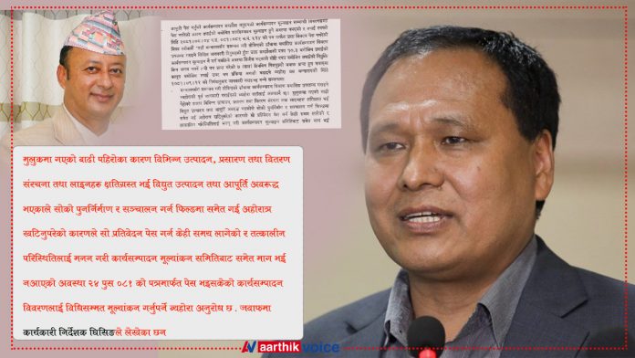 साथै, प्राधिकरण सञ्चालक समितिको ४ पुसमा बैठकको माइन्युटमा मन्त्रालयले गठन गरेको प्राविधिक जाँच समितिलाई आवश्यक सहयोग उपलब्ध गराउने एजेन्डामा नोट अफ डिसेन्ट लेखी सरकारको निर्देशनको अवज्ञा गर्नुभएको भनी चौथो बुँदामा सोधिएको प्रश्नमा कार्यकारी निर्देशक घिसिङले लेखेका छन् डेडिकेटेड तथा ट्रंकलाइनबाट विद्युत् आपूर्ति लिएका ग्राहकहरूको बक्यौता महसुल असुल गर्नुपर्ने भनी महालेखापरीक्षकको कार्यालय, सार्वजनिक लेखा समिति, विद्युत् नियमन आयोग तथा विभिन्न सम्मानित अदालतहरूबाट फैसला आदेश भएको, मन्त्रिपरिषद्बाट समेत महसुल उठाउन निर्णय भएको एवं उक्त जाँचबुझ समिति अवैध र गैर कानुनी छ भनी सार्वजनिक सरोकारको विषयको रूपमा प्रश्न उठाई प्राधिकरणसमेतलाई विपक्षी बनाई सम्मानित सर्वोच्च अदालतमा दर्ता भएको मुद्दा हाल विचाराधीन रहेको अवस्थामा प्राधिकरणले छुट महसुल लिने भनी गरेको निर्णय तथा जारी गरेको बिलरविजक उपर प्राधिकरण तथा विद्युत् नियमन आयोगको नियमानुसार सेवा शुल्क धरौटी राखी अधिकारप्राप्त निकायमा पुनरावलोकन गर्न सक्ने सुविधालाई समेत प्रभावित हुने गरी मन्त्रालयबाट उक्त जाँचबुझ कमिटी गठन हुनु निर्धारित विधि र प्रक्रियासम्मत नहुनुको साथै क्षेत्राधिकारविहीन भएको देखिएकाले विधिको शासन, संस्थागत हित एवं पदीय दायित्व र कर्तव्य पालन गर्दै सो सम्बन्धमा आफ्नो मत दर्ज गरेको हुँ ।