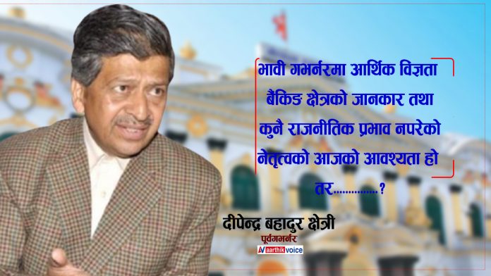 ‘राष्ट्र बैकको गभर्नर कुनै पनि आग्रह–पूर्वाग्रहमा पर्नु हुँदैन यसको गरीमा र महत्त्व असाध्यै ठुलो हो यसकारण व्यक्ति केन्द्रित भन्दा पनि अनुभव, दक्षता,क्षमता र पदीय जिम्मेवारी बोध गर्न सक्ने हुनुपर्छ भन्ने मेरो धारणा हो, क्षेत्रीले भने ।