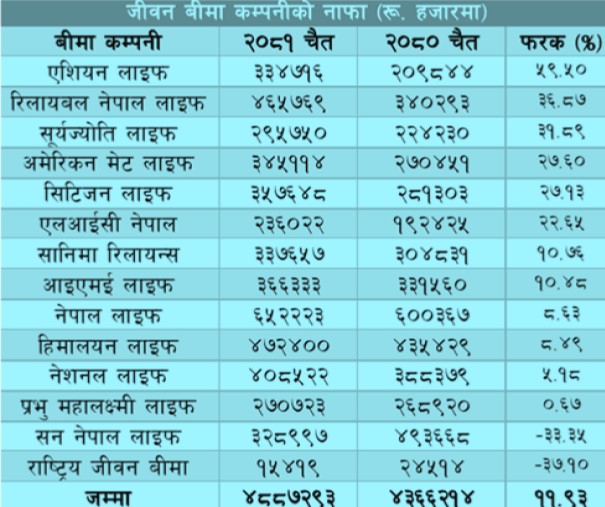 यो अवधिमा आइएमई लाइफको १०.४८ प्रतिशत बढेर ३६ करोड ६३ लाख ३३ हजार रुपैयाँ, हिमालयन लाइफको ८.४९ प्रतिशत बढेर ४७ करोड २४ लाख रुपैयाँ, नेशनल लाइफको ५.१८ प्रतिशत बढेर ४० करोड ८५ लाख २२ हजार रुपैयाँ र प्रभु महालक्ष्मी लाइफको ०.६७ प्रतिशत बढेर २७ करोड ७ लाख २३ हजार रुपैयाँ नाफा आर्जन भएको छ ।