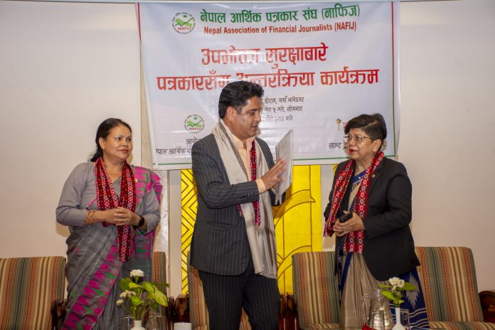 काठमाडौँ । नेपाल आर्थिक पत्रकार संघ (नाफिज) र साल्ट ट्रेडिङ कर्पोरेसनको संयुक्त आयोजनामा पत्रकारसँग उपभोक्ता सुरक्षासम्बन्धी अन्तरक्रिया कार्यक्रम सम्पन्न भएको छ । सोमबार काठमाडौँमा सम्पन्न कार्यक्रमलाई उद्योग वाणिज्य तथा आपूर्ति मन्त्री दामोदर भण्डारीले उद्घाटन गरेका हुन् ।