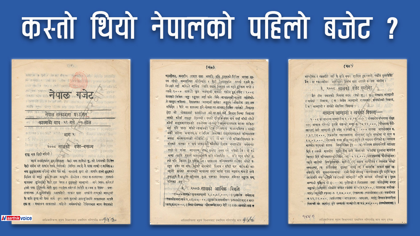 काठमाडौँ । नेपालमा बजेट पहिलो पटक वि.सं. २००८ माघ २१ मा ल्याइएको थियो । त्यसबेला सरकारको नेतृत्व प्रधानमन्त्री मातृकाप्रसाद कोइरालाले गरिरहेका थिए । तत्कालीन अर्थमन्त्री सुवर्णशमशेरले प्रस्तुत गरेको उक्त बजेटलाई हिमालय शमशेर जबराले तयार पारेका थिए । त्यसबेला हिमालय शमशेर अर्थ सचिव थिए । उनी नेपालकै पहिलो अर्थ सचिव समेत हुन् ।