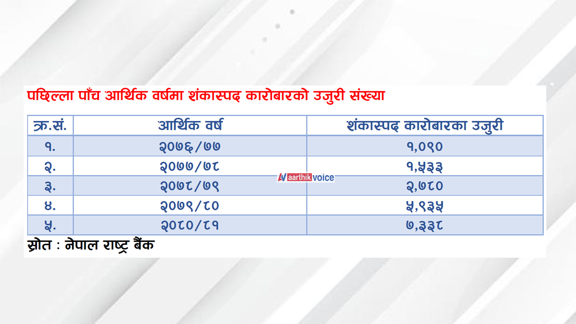 पछिल्ला वर्षहरूको तथ्यांक हेर्ने हो भने बैंक तथा वित्तीय संस्थाहरूमा हुने शंकास्पद कारोबारसँग सम्बन्धित उजुरी बढेको देखिन्छ । नेपाल राष्ट्र बैंकको वित्तीय जानकारी इकाईको आर्थिक वर्ष २०८०/८१ को प्रतिवेदन अनुसार गत आर्थिक वर्षमा त्यस्ता ७ हजार ३३८ वटा उजुरी परेका थिए । आर्थिक वर्ष २०७६/७७ मा त्यस्ता कुल १ हजार ९० उजुरी परेका थिए । त्यसयता हरेक वर्ष यो संख्या बढेर गइरहेको छ ।