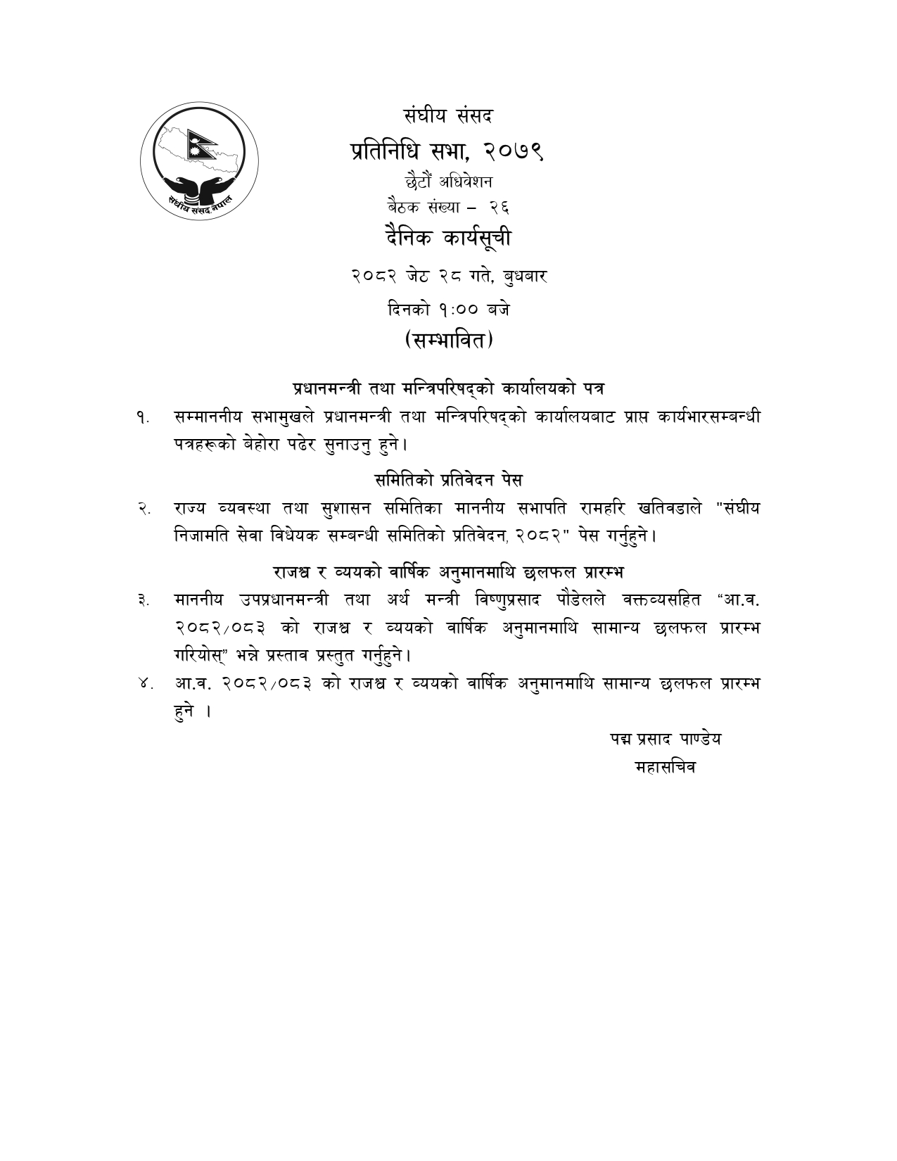 संसद सचिवालयका अनुसार आजको बैठकमा उपप्रधानमन्त्री एवम् अर्थमन्त्री विष्णुप्रसाद पौडेलले वक्तव्यसहित ‘आर्थिक वर्ष २०८२–०८३ को राजश्व र व्ययको वार्षिक अनुमानमाथि सामान्य छलफल गरियोस्’ भन्ने प्रस्ताव पेस गर्ने र सो प्रस्तावमाथि छलफल हुने सम्भावित कार्यसूची छ।