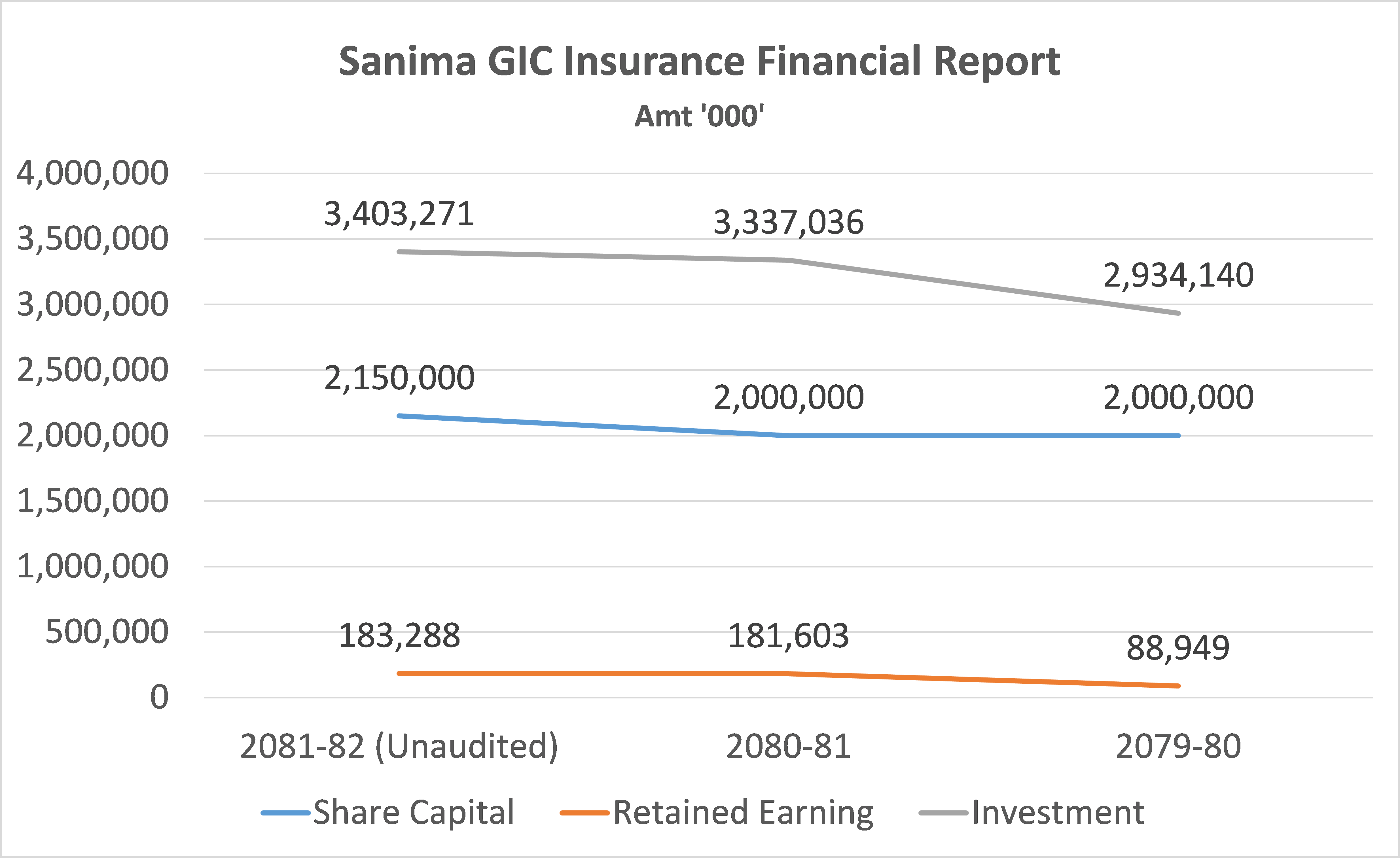 सानिमा जिआईसीको चुक्ता पूँजी २ अर्ब १५ करोड रहेको छ । अघिल्लो वर्ष कम्पनीको पूँजी २ अर्ब रुपैयाँ बराबर रहेको थियो । सञ्चित नाफा १८ करोड ३२ लाख रुपैयाँ छ । कम्पनीले बीमा प्राधिकरणले तोके अनुसारको पूँजी वृद्धि गर्नका लागि १७ प्रतिशत हकप्रद प्रस्ताव गरेको छ । हकप्रदपछि पूँजी साढे २ अर्ब भन्दा धेरै पुग्नेछ । यस कम्पनीले असारसम्म ३ अर्ब ४० करोड रुपैयाँ लगानी गरेको छ । ३ वर्ष अगाडि कम्पनीको लगानी २ अर्ब ९३ करोड थियो ।