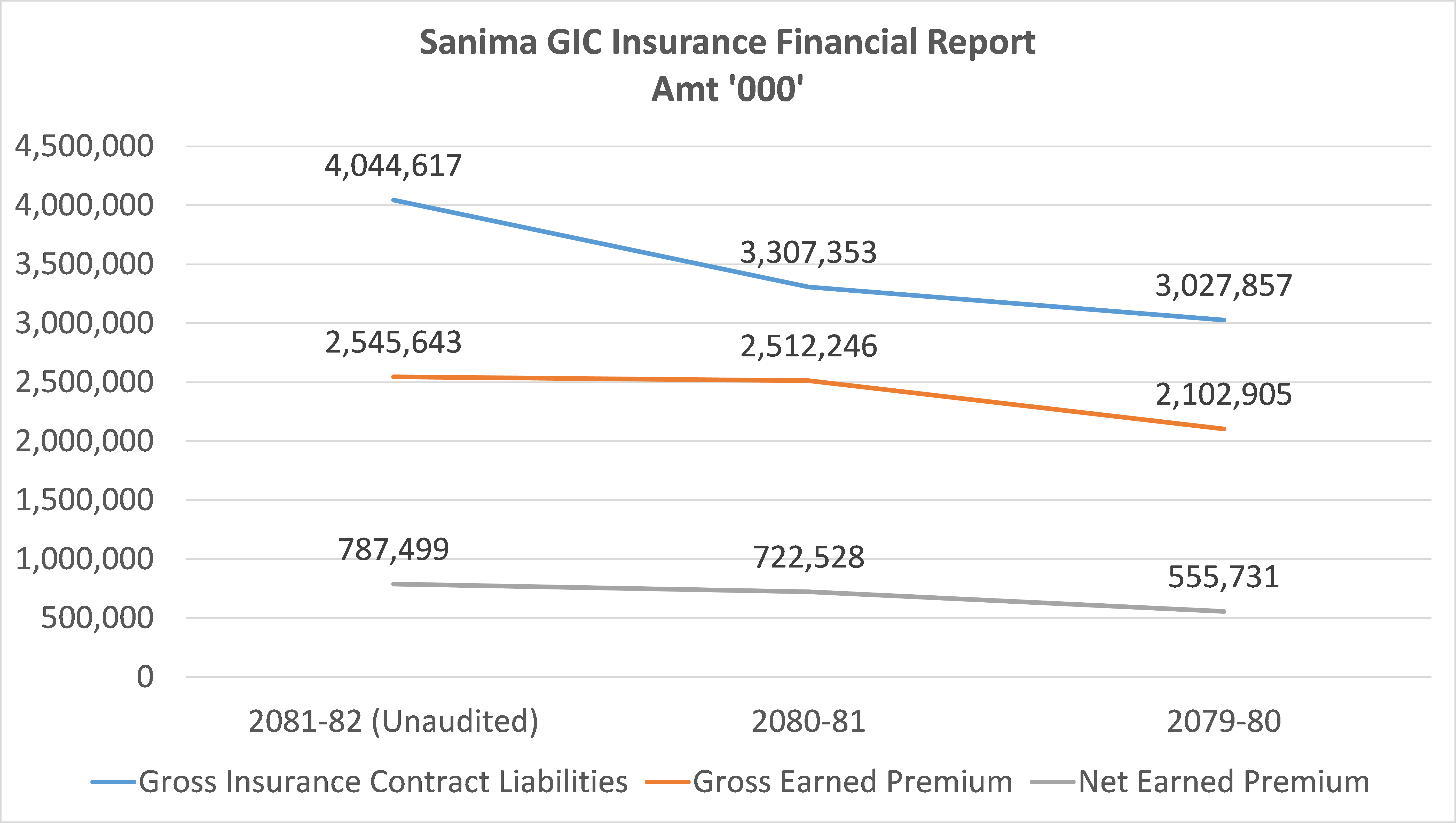 सानिमा जिआईसीको कुल बीमा शुल्क संकलन २ अर्ब ५४ करोड पुगेको छ । यो अघिल्लो वर्षको भन्दा धेरै हो । अघिल्लो वर्ष बीमाले २ अर्ब ५१ करोड कुल बीमा शुल्क संकलन गरेको थियो । खुद बीमा शुल्क संकलन भने ७८ करोड ७४ लाख रुपैयाँ पुगेको छ । ३ वर्ष अगाडि उक्त शुल्क संकलन ५५ करोड ५७ लाख रुपैयाँ थियो । बीमा कोषमा ४ अर्ब रुपैयाँ भन्दा धेरै रकम छ ।