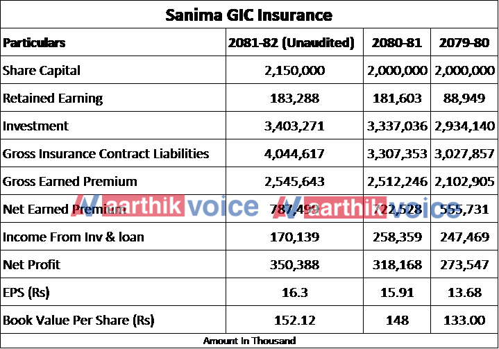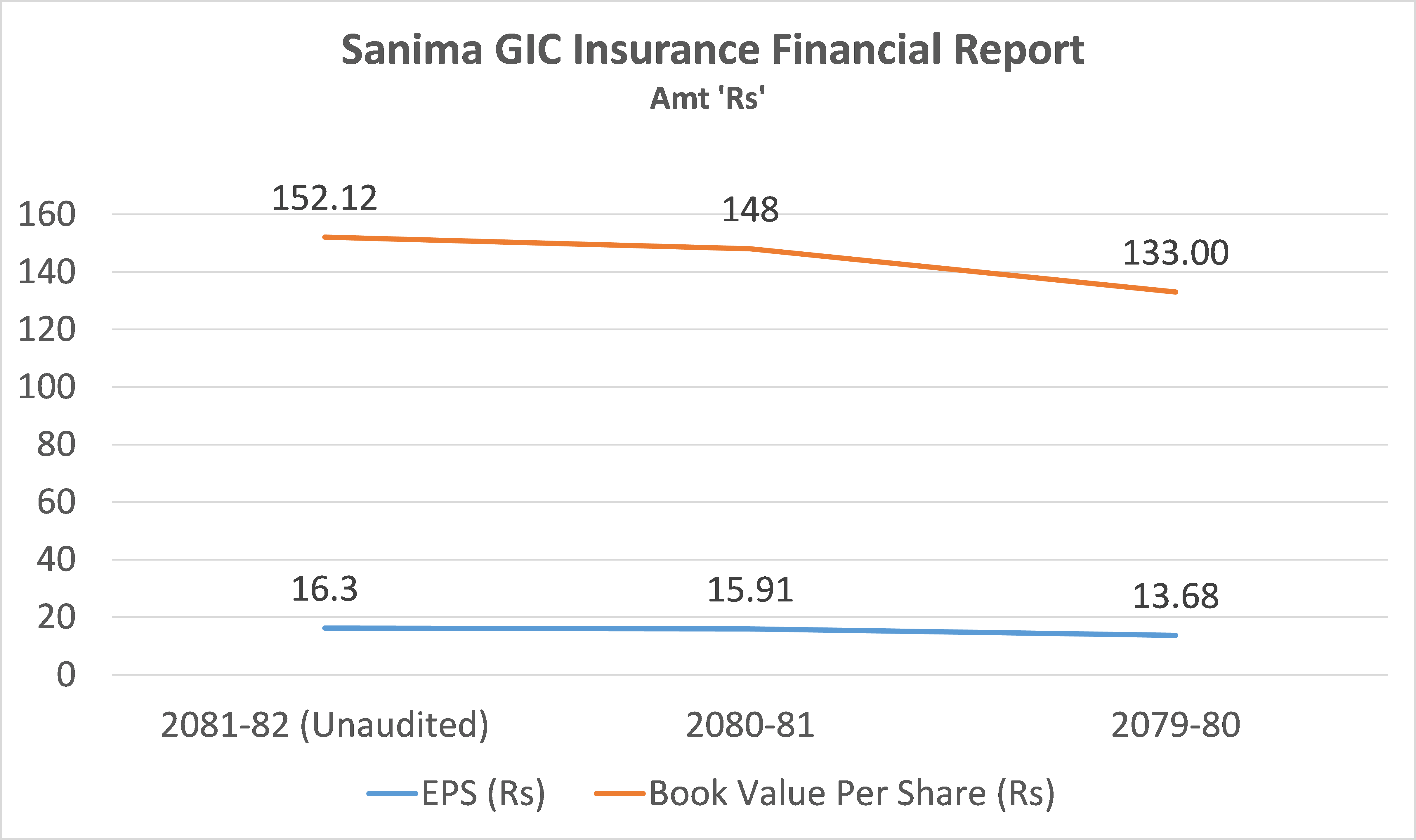 सानिमा जिआईसीको प्रतिशेयर आम्दानी १६.३० रुपैयाँ छ । यो अघिल्लो वर्षको भन्दा धेरै हो । साथै, यस बीमाको प्रतिशेयर नेटवर्थ १५२.१२ रुपैयाँ छ । पछिल्लो ३ वर्षमा कम्पनीको नेटवर्थमा सुधार आएको छ ।