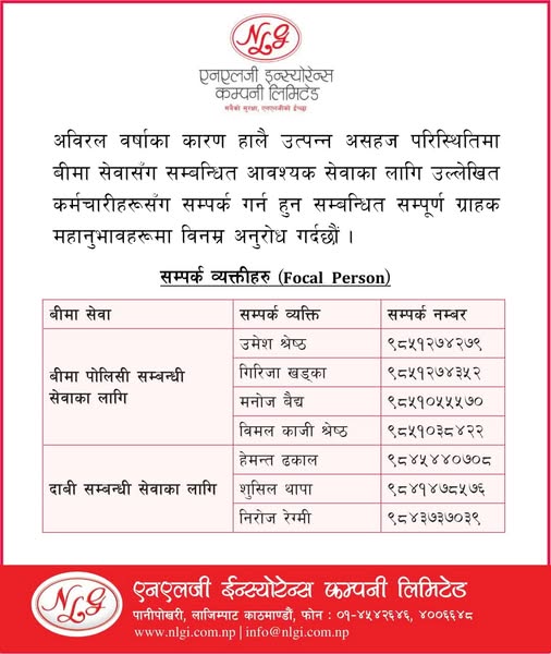 काठमाडौं । एनएलजी इन्स्योरेन्स कम्पनी लिमिटेडले अविरल वर्षाका कारण उत्पन्न भएको असहज परिस्थितीमा पनि बीमा सवा प्रदान गरिरहेको छ ।