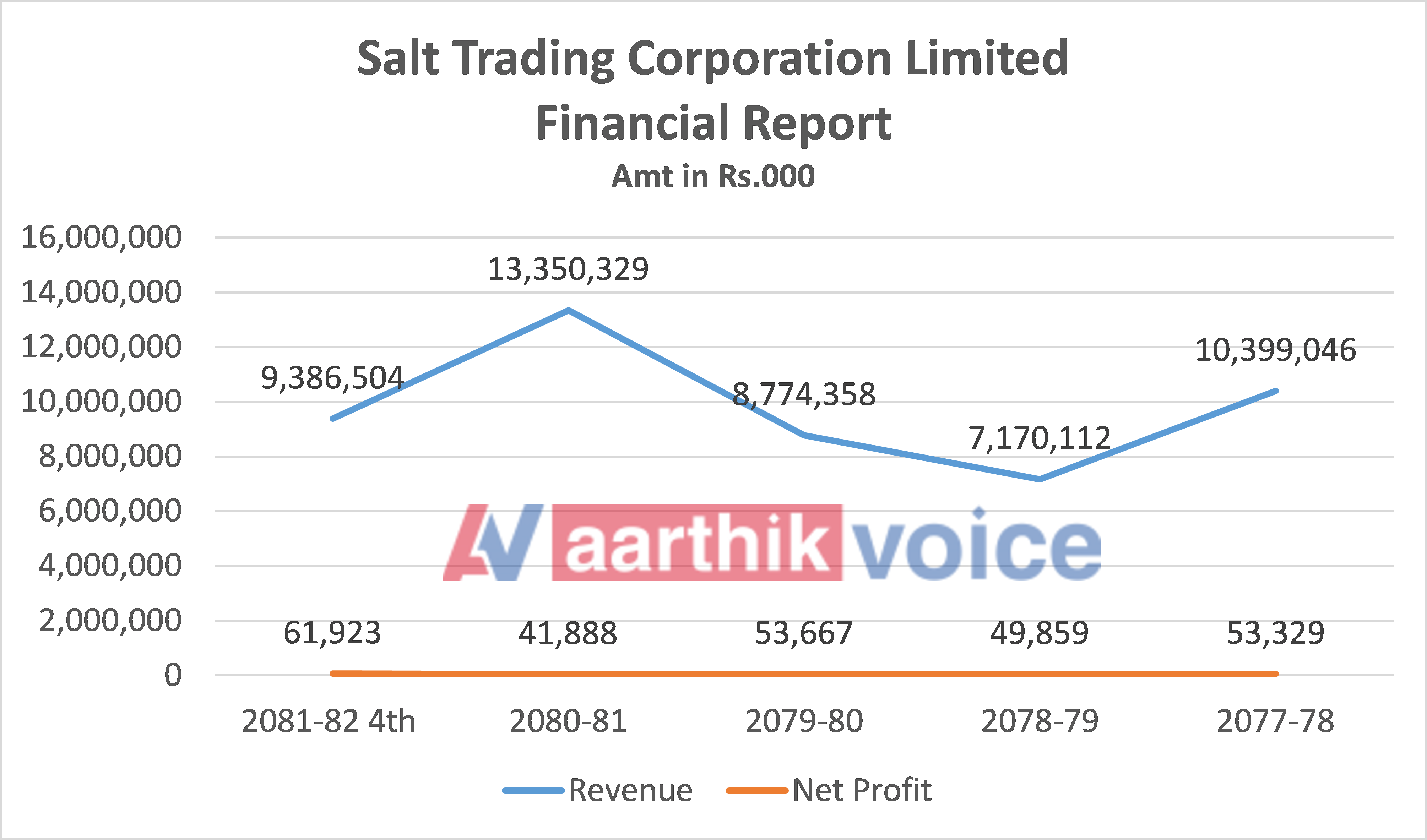 साल्ट ट्रेडिङले गत वर्ष ९ अर्ब ३८ करोड ६५ लाख रुपैयाँ आम्दानी गरेको छ । अघिल्लो वर्ष संस्थाले १३ अर्ब ३५ करोड आम्दानी गरेको थियो । यता, कम्पनीले गत वर्षको असारसम्म ६ करोड १९ करोड रुपैयाँ नाफा कमाएको छ । अघिल्लो वर्ष ४ करोड १८ लाख रुपैयाँ नाफा कमाएको थियो ।