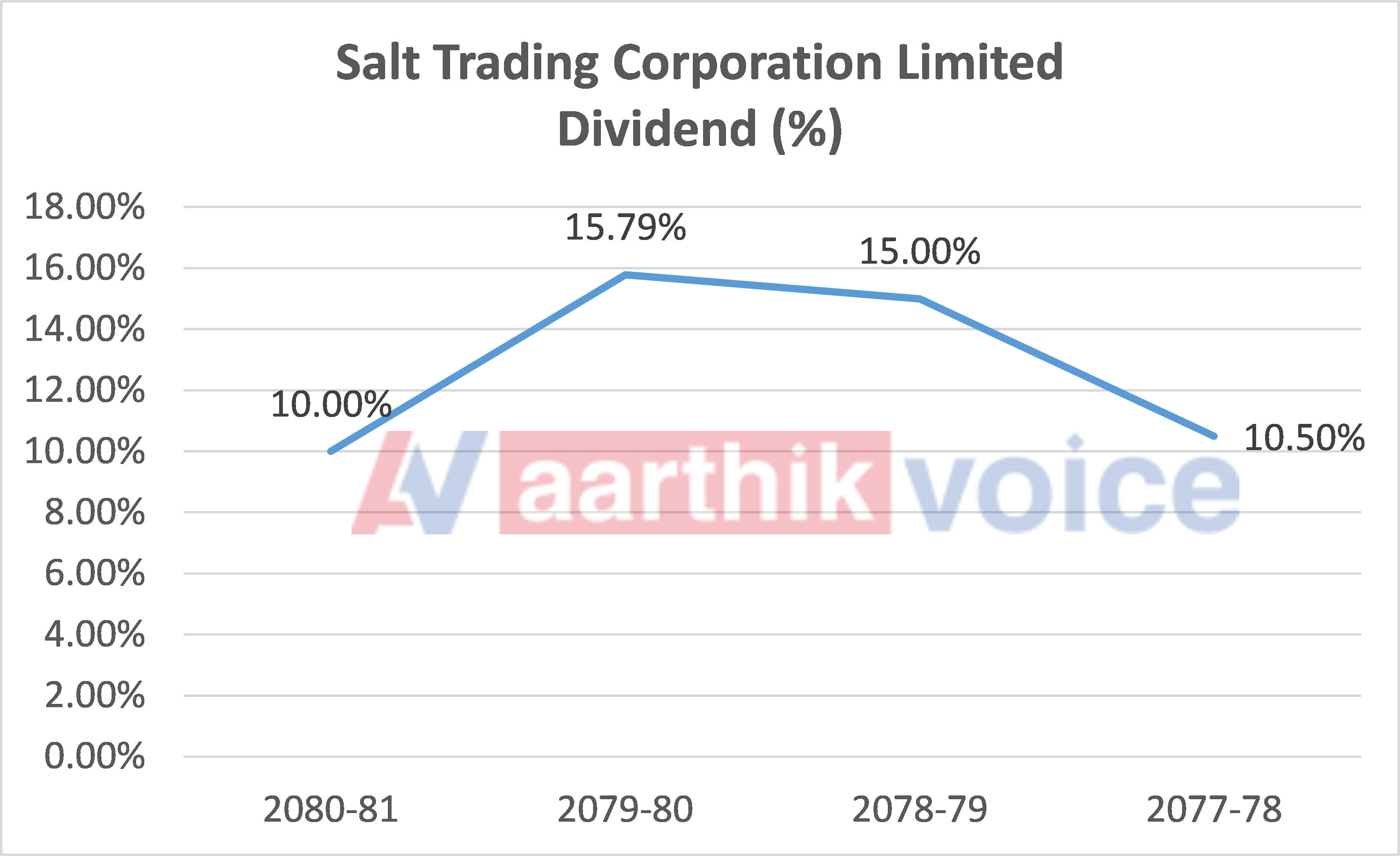 साल्ट ट्रेडिङले आव २०८०-८१ मा १० प्रतिशत लाभांश वितरण गरेको थियो । त्यसअघि २०७९-८० मा कम्पनीले १५.७९ प्रतिशत लाभांश दिएको थियो ।