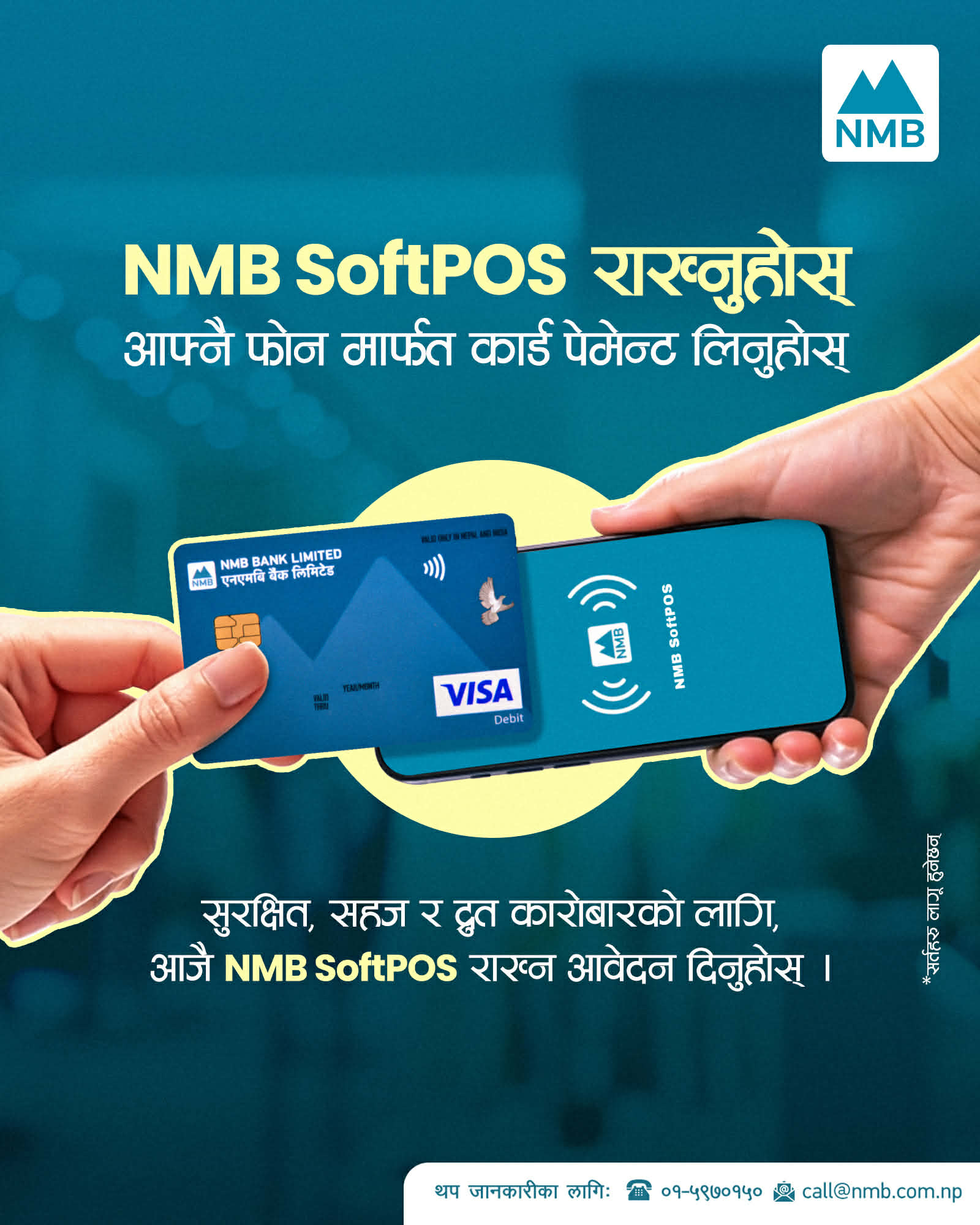 काठमाडौं । एनएमबि बैंकले नेपालमा पहिलोपटक सफ्टपोस (Soft POS) सेवा सुरु गर्दै डिजिटल भुक्तानी प्रविधिमा एक महत्वपूर्ण कदम अघि बढाएको छ । कुनै पनि ल्ँऋ सपोर्ट गर्ने एन्ड्रोइड मोबाइल फोनलाई पोस मेसिनको रूपमा प्रयोग गर्न सकिनेछ ।