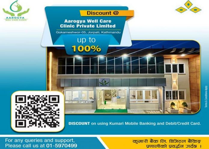 काठमाडौं । कुमारी बैंकका ग्राहक तथा कर्मचारीहरूले आरोग्य वेल केयर क्लिनिक प्रालिमा स्वास्थ्य सेवा लिँदा १०० प्रतिशतसम्म छुट पाउने भएका छन् । बैंकले आफ्ना ग्राहकहरूलाई लाभान्वित तुल्याउन उक्त क्लिनिकसँग विशेष छुट दिनेसम्बन्धी सम्झौता गरेको छ ।