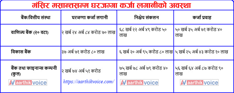 घरजग्गा क्षेत्रमा प्रवाहित कर्जा अघिल्लो आर्थिक वर्षको सोही अवधिको तुलनामा २ अर्ब ८२ करोड ९० लाख रुपैयाँले बढी हो। गत आर्थिक वर्षको सोही अवधिमा बैंक तथा फाइनान्स कम्पनीहरूले रियलस्टेट क्षेत्रमा मात्र २ खर्ब ७७ अर्ब ३३ करोड ९० लाख रुपैयाँ कर्जा प्रवाह गरेका थिए। त्यतिबेला कुल निक्षेप संकलन ६६ खर्ब ८० अर्ब ९४ करोड ९० लाख रुपैयाँ र कुल कर्जा प्रवाह ५३ खर्ब २४ अर्ब ९९ करोड ६० लाख रुपैयाँ रहेको थियो।