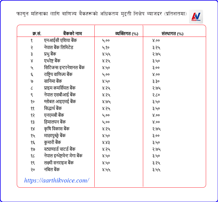 फागुन महिनाका लागि बैंकअनुसार अधिकतम ब्याजदर