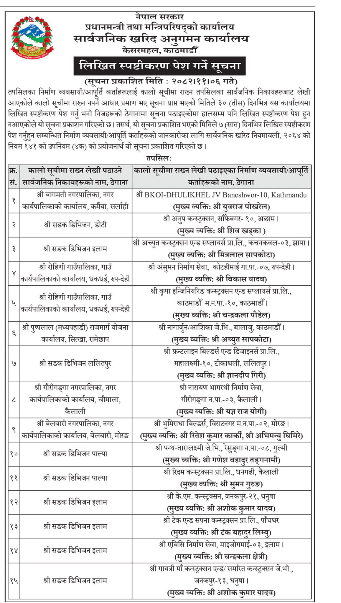 सूचनाअनुसार सडक डिभिजन कार्यालय इलाम, सडक डिभिजन कार्यालय पाल्पा, सडक डिभिजन कार्यालय ललितपुर लगायतका निकायको सिफारिसमा परेका व्यवसायीहरूलाई स्पष्टीकरणको दायरामा ल्याइएको हो ।