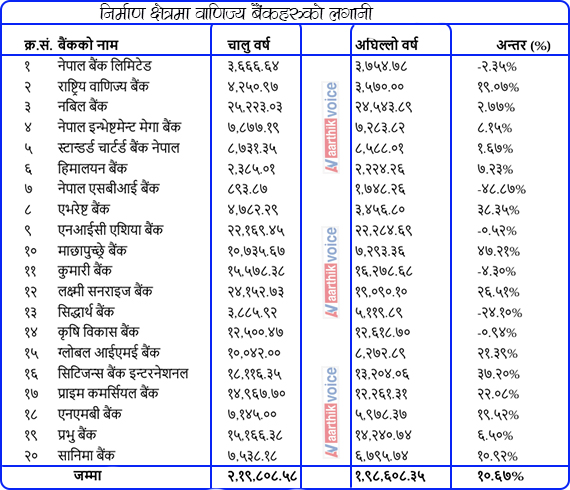 नेपाल राष्ट्र बैंकले सार्वजनिक गरेको तथ्यांकअनुसार बैंकहरूको निर्माण क्षेत्रमा लगानी क्रमशः विस्तार हुँदै गएको देखिन्छ, जसले पूर्वाधार, आवास तथा भौतिक संरचना विकासमा वित्तीय क्षेत्रको सक्रियता बढेको देखाएको छ। चालु आवको पुस मसान्तसम्म निर्माण क्षेत्रमा सबैभन्दा धेरै लगानी गर्ने बैंकको रूपमा नबिल बैंक अग्रस्थानमा रहेको छ। बैंकले २५ अर्ब २२ करोड ३० लाख रुपैयाँ लगानी गरेको छ, जुन गत आवको सोही अवधिको २४ अर्ब ५४ करोड ३८ लाख रुपैयाँको तुलनामा २.७६ प्रतिशतले बढी हो।
