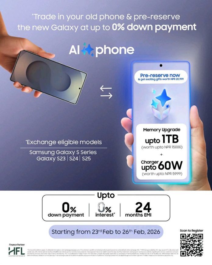 काठमाडौं । सामसङले आफ्नो आगामी Galaxy स्मार्टफोनको आधिकारिक लन्चभन्दा अघि नै ग्राहकहरूका लागि आकर्षक “Hand Raiser” (Pre-Reserve) अफर सार्वजनिक गरेको छ। यस अफरमार्फत ग्राहकहरूले नयाँ Galaxy स्मार्टफोनको अग्रिम बुकिङ गर्दै अधिकतम रु. २०,९९९ सम्मका विशेष लाभहरू प्राप्त गर्न सक्नेछन्।