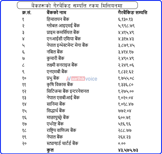 यो रकम अघिल्लो वर्षको सोही अवधिमा रहेको ३४ अर्ब ८६ करोड ५६ लाख रुपैयाँको तुलनामा २४.९८ प्रतिशत बढी हो।समीक्षा अवधिमा १५ वाणिज्य बैंकको गैरबैंकिङ सम्पत्ति बढेको छ भने ४ बैंकले घटाउन सफल भएका छन्।