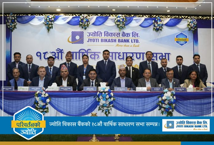 काठमाडौं । ज्योति विकास बैंक लिमिटेडको १८औं वार्षिक साधारण सभा सम्पन्न भएको छ । बिहीबार बैंकका सञ्चालक समितिका अध्यक्ष हरि चन्द्र खड्काको सभापतित्वमा उक्त वार्षिक सभा सम्पन्न भएको हो।