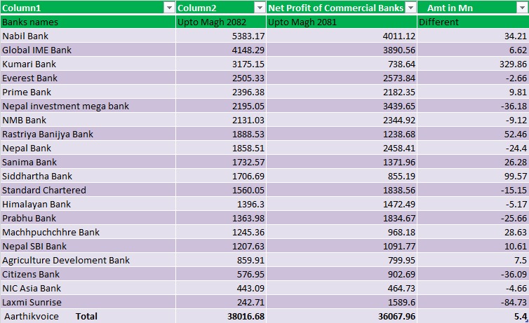 यो नाफा गत आर्थिक वर्षको सोही अवधिको तुलनामा ५.४० प्रतिशतले बढी हो। गत आवको सोही अवधिसम्म वाणिज्य बैंकहरूले ३६ अर्ब ६ करोड ७९ लाख रुपैयाँ नाफा कमाएका थिए। सो अवधिमा करिब आधा बैंकको नाफा बढेको छ भने बाँकी आधा बैंकको नाफा गत वर्षको तुलनामा घटेको देखिन्छ।