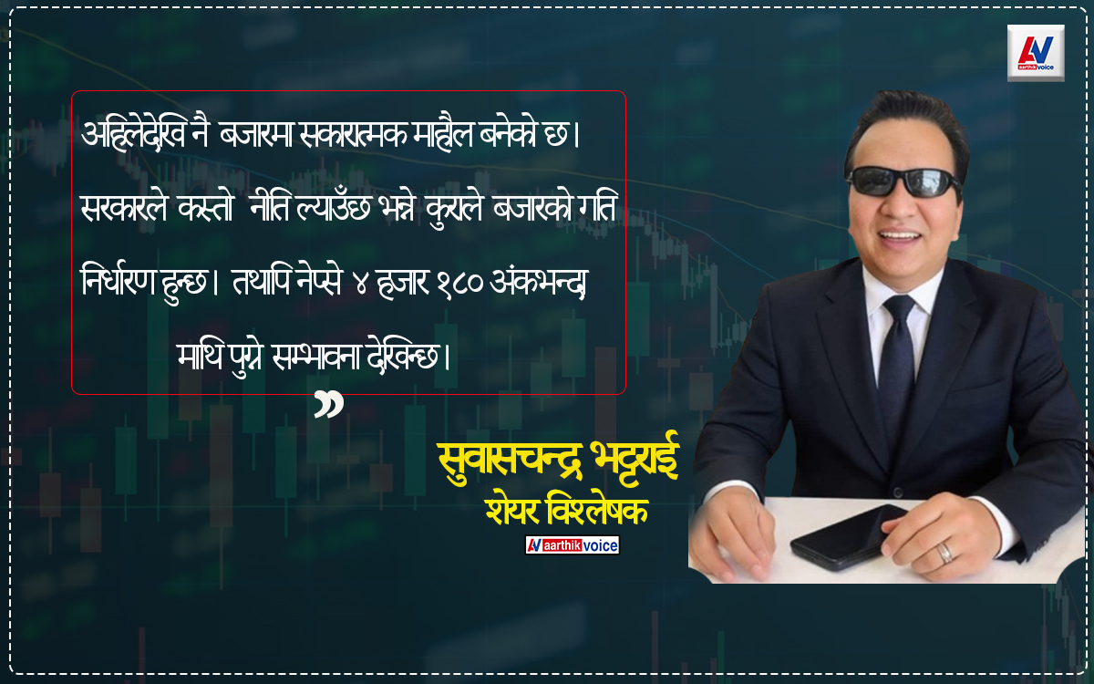भट्टराईले चालु आर्थिक वर्षभित्रै नेप्से परिसूचक उल्लेखनीय रूपमा बढ्न सक्ने बताएका छन्। उनका अनुसार नेप्से ४ हजार १८० अंकभन्दा माथि पुग्ने सम्भावना देखिएको छ।
