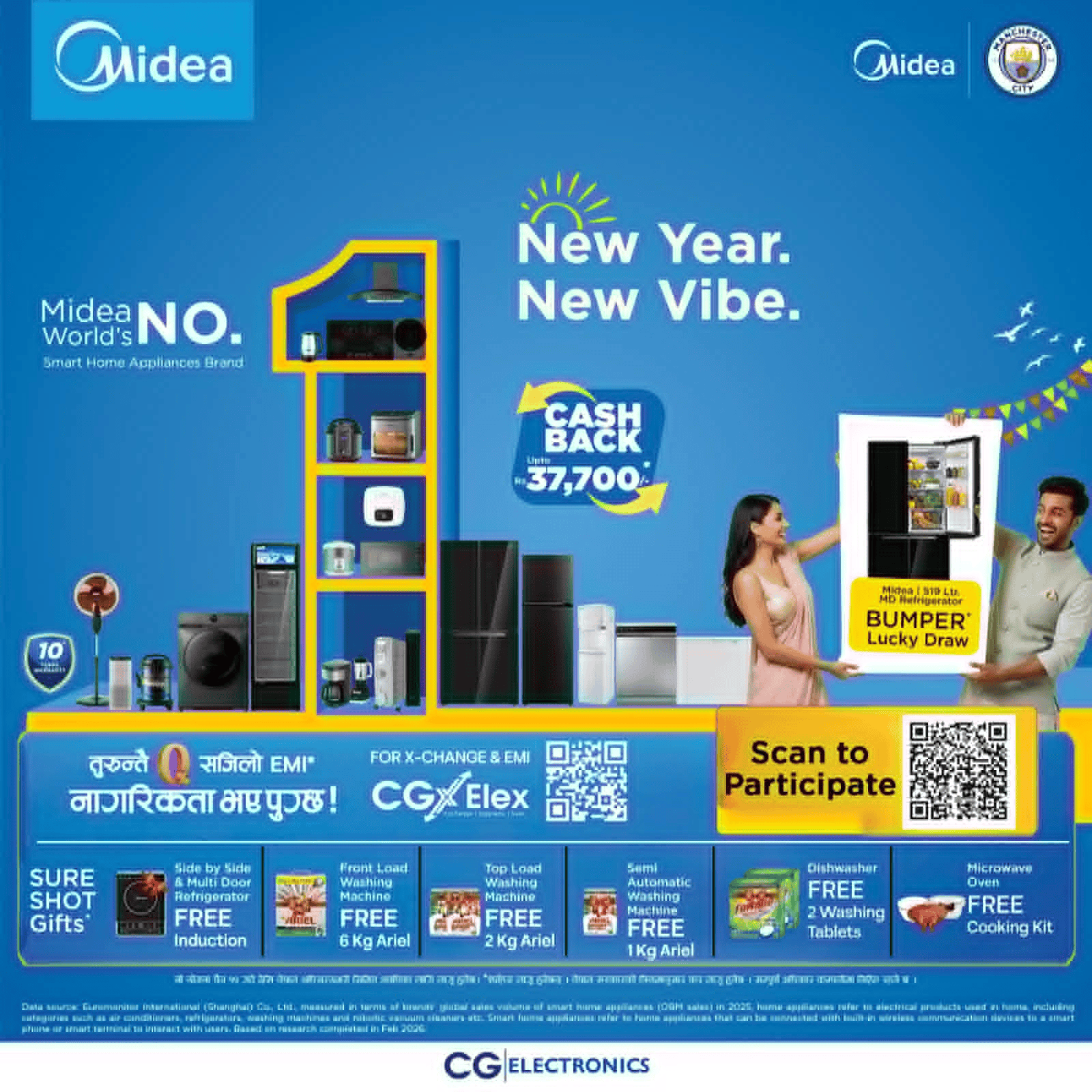 काठमाडौं। नयाँ वर्षको सुरुवातसँगै घरायसी जीवनलाई अझ स्मार्ट, सहज र आधुनिक बनाउने उद्देश्यले विश्वकै अग्रणी स्मार्ट होम एप्लायन्स ब्रान्ड माइडिया ले “New Year. New Vibe.” अभियान सार्वजनिक गरेको छ। नयाँ वर्षलाई नयाँ ऊर्जा, नयाँ सुविधा र नयाँ जीवनशैलीसँग जोड्ने सोचका साथ ल्याइएको यस अभियानले उपभोक्तालाई आकर्षक अफरहरूसँगै मूल्यवान खरिद अनुभव प्रदान गर्ने लक्ष्य राखेको कम्पनीले जनाएको छ।