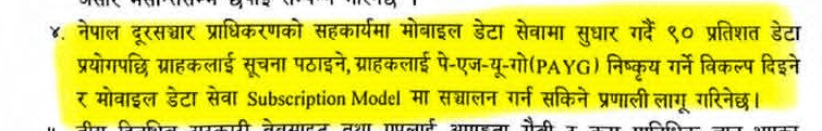मन्त्रालयले नेपाल दूरसञ्चार प्राधिरणको सहकार्यमा मोबाइल डाटा सेवामा सुधार गदै ९० प्रतिशत डाटा प्रयोगपछि ग्राहकलाई सूचना पठाउने, ग्राहकलाई ‘पे–एज–यू–गो’ निष्कृय गर्ने विकल्प दिने र मोबाइल डाटा सेवा सब्स्क्रिप्सन मोडेलमा सञ्चालन गर्न सकिने प्रणाली लागू गर्न सकिने जनाएको छ।