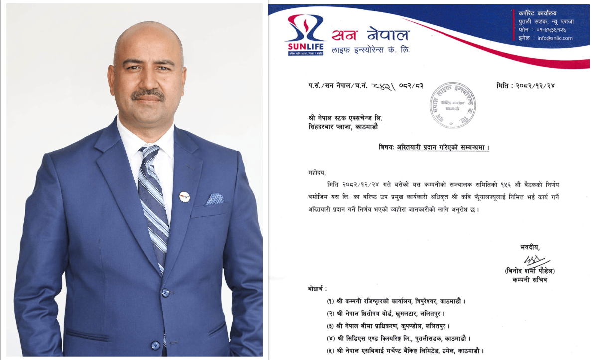 काठमाडौँ। सन नेपाल लाइफ इन्स्योरेन्स कम्पनी लिमिटेडको सञ्चालक समितिले कम्पनीको निमित्त प्रमुख कार्यकारी अधिकृत (सीईओ)को जिम्मेवारी कवि फुयाँललाई सुम्पिएको छ।