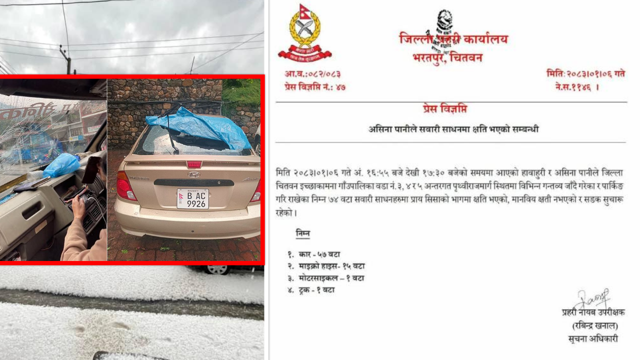जिल्ला प्रहरी कार्यालय चितवनका अनुसार करिब ३५ मिनेटसम्म चलेको प्रतिकूल मौसमका कारण सडक किनारमा पार्किङ गरी राखिएका सवारी साधनमा असर परेको हो।