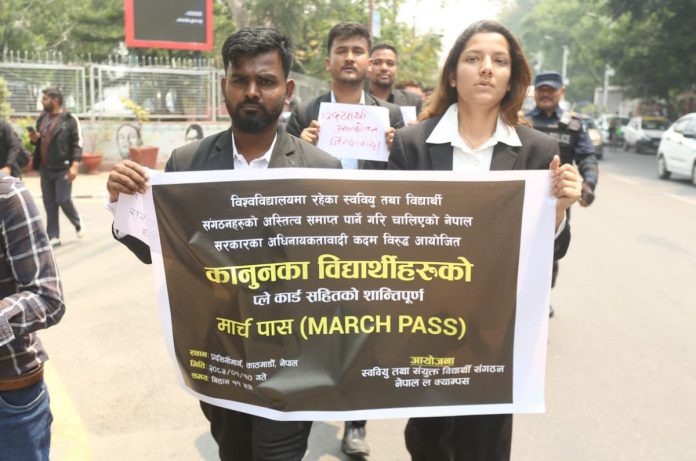 बिहीबार नेपाल ल क्याम्पस स्ववियु तथा संयुक्त विद्यार्थी संगठनको आयोजनामा विद्यार्थीले सरकारको अधिनायकवादी कदमविरुद्ध प्लेकार्डसहित शान्तिपूर्ण मार्चपास गरेका हुन्।
