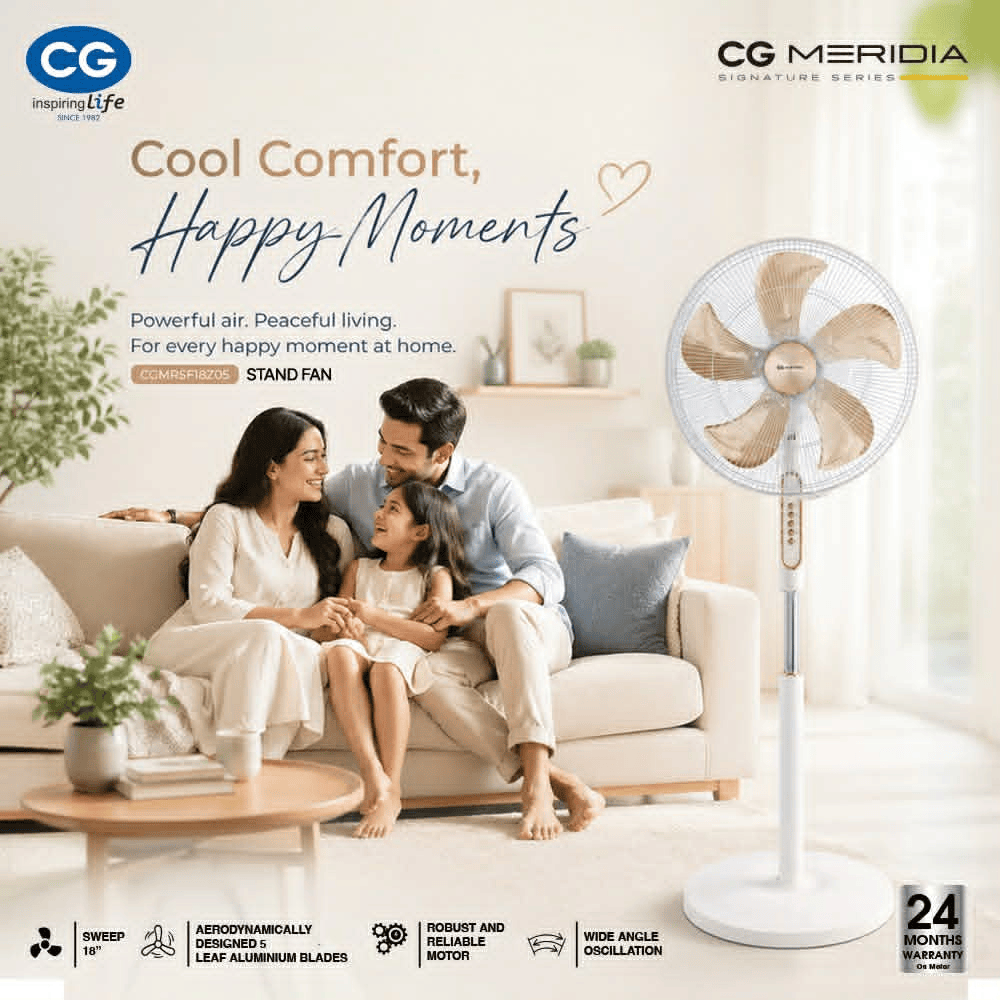 - सीजी स्ट्यान्ड फ्यान रेन्ज (९ मोडल): आम उपभोक्ताको दैनिक आवश्यकता र किफायती मूल्यमा उच्च कार्यक्षमता सुनिश्चित गर्न ९ वटा विभिन्न भेराइटीका स्ट्यान्ड फ्यानहरू उपलब्ध छन्। यो रेन्जले घरदेखि कार्यालयसम्मका हरेक आवश्यकतालाई पूरा गर्दछ।