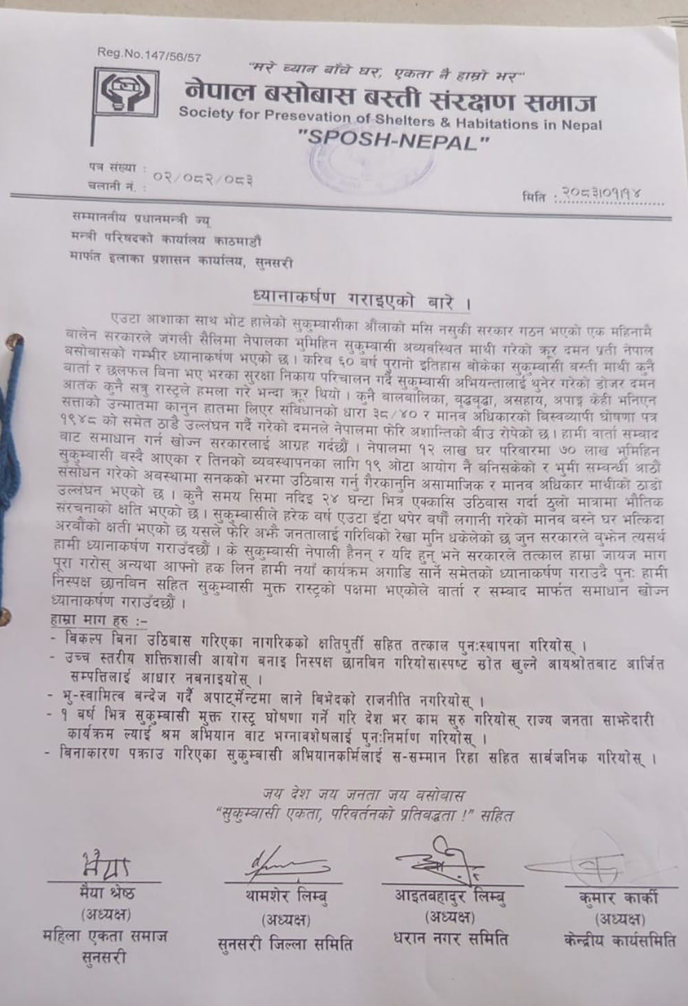 समाजले सुकुमबासीको विषयमा छानबिन नै नगरी प्रहरी प्रशासन लगाएर ज्यादती गरेको भन्दै सरकारलाई ज्ञापन पत्र बुझाएको हो । सुकुमबासी र भूमिहीनका ६० वर्ष पुराना बस्तीहरूमाथि बिनाविकल्प र बिना संवाद डोजर चलाएको भन्दै उनीहरुले विरोध जनाएका छन् ।