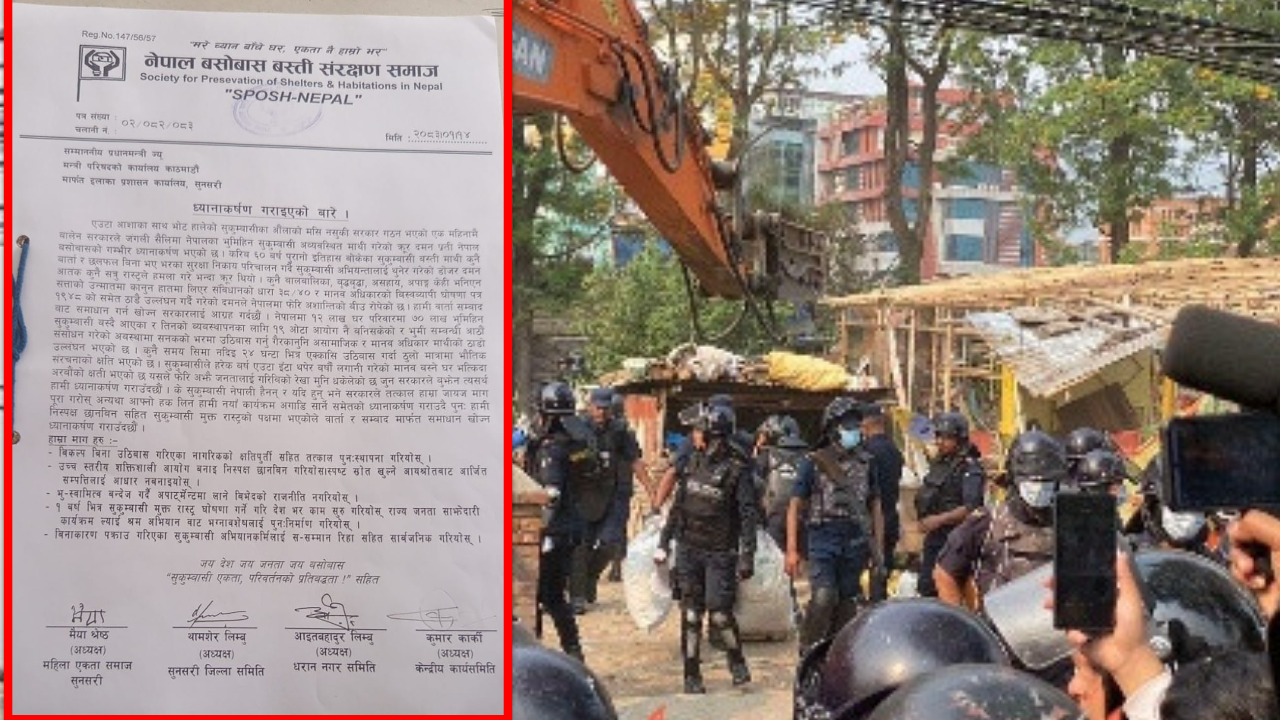 काठमाडौँ। नेपाल बसोबास बस्ती संरक्षण समाजले सरकारले सुकुमबासी बस्तीहरूमा डोजर चलाएकोप्रति जिल्ला प्रशासन कार्यालयमार्फत् ध्यानाकर्षण पत्र बुझाएको छ।