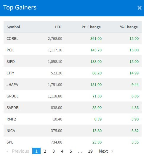 आजको कारोबारमा कर्पोरेट डेभलपमेन्ट बैंक, पाल्पा सिमेन्ट र शिखर पावर डेभलपमेन्टको सेयर मूल्य १५ प्रतिशतले उकालो लागेको छ भने सिटी होटलको मूल्य १४.९९ प्रतिशतले वृद्धि भएको छ।