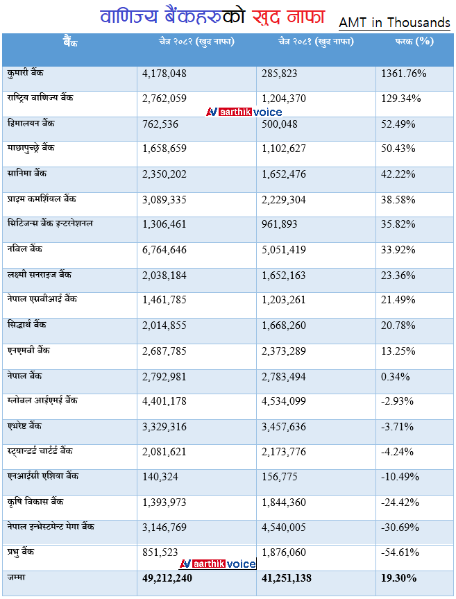समग्रमा २० वाणिज्य बैंकहरूको खुद नाफा गत वर्षको सोही अवधिको तुलनामा १९.३० प्रतिशतले वृद्धि भई ४९ अर्ब २१ करोड रुपैयाँ पुगेको छ। यसले विभिन्न आर्थिक चुनौतीबीच पनि नेपाली बैंकिङ क्षेत्र क्रमशः सुदृढ बन्दै गएको देखाउँछ।