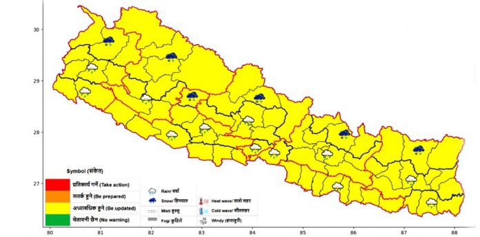 जल तथा मौसम विज्ञान विभागले वैशाख १५ गतेका लागि कोशी, मधेश, बागमती र गण्डकी प्रदेशका जिल्ला तथा वैशाख १६ गतेका लागि सबै सातवटै प्रदेशका जिल्लाहरुलाई पहेँलो रंगले संकेत गर्दै मौसमको अध्यावधिक जानकारी लिएर मात्रै आफ्नो काम गर्न सतर्क गराएको छ ।