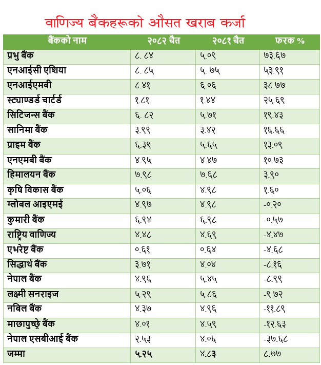 एनएमबि बैंकको खराब कर्जा ४.९५ प्रतिशत, हिमालयन बैंकको ७.९८ प्रतिशत, कृषि विकास बैंकको ५.०६ प्रतिशत, नेपाल एसबीआई बैंकको २.५३ प्रतिशत, माछापुच्छ्रे बैंकको ४.०१ प्रतिशत, नबिल बैंकको ४.३७ प्रतिशत, लक्ष्मी सनराइज बैंकको ५.२९ प्रतिशत, नेपाल बैंकको ४.९६ प्रतिशत र सिद्धार्थ बैंकको ३.७१ प्रतिशत रहेको छ ।